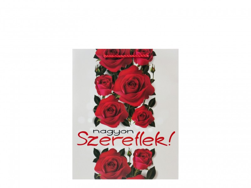 Rózsás mintájú ajándéktasak Nagyon szeretlek felirattal, romantikus csomagoláshoz 18x10x23 cm méretben.
