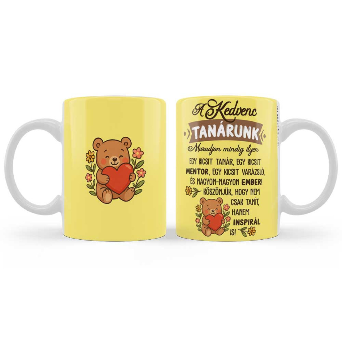 Az A kedvenc tanárunk feliratos ajándék bögre 3 dl űrtartalmú kivitelben szívhez szóló meglepetés minden pedagógus számára, aki nemcsak tanít, hanem inspirál is. A kedves szöveg és az aranyos grafika különösen alkalmassá teszi pedagógusnapi ajándéknak, ballagásra, évzáróra vagy köszönetnyilvánításként az iskolai év végén. A bögre minőségi kerámiából készült, mindennapi használatra ideális kávé, tea vagy más meleg ital fogyasztásához, miközben emlékezteti a tanárt arra, milyen fontos szerepet tölt be diákjai életében. Ajándék bögrének keresve tökéletes választás tanítóknak, tanároknak és óvónőknek egyaránt.