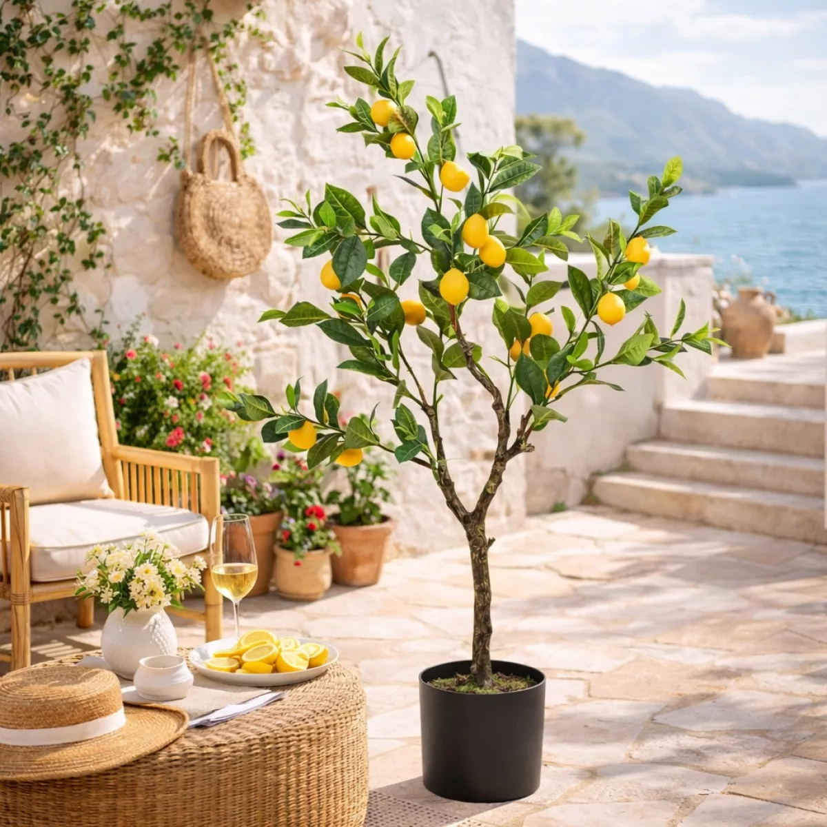 Ez az élethű citromfa műnövény a mediterrán életérzés tökéletes megtestesítője. A részletgazdag levelek és a természetes hatású, élénk sárga citromok együttese friss, napfényes hangulatot teremt, mintha egy olasz vagy görög kert hangulatát idézné meg.