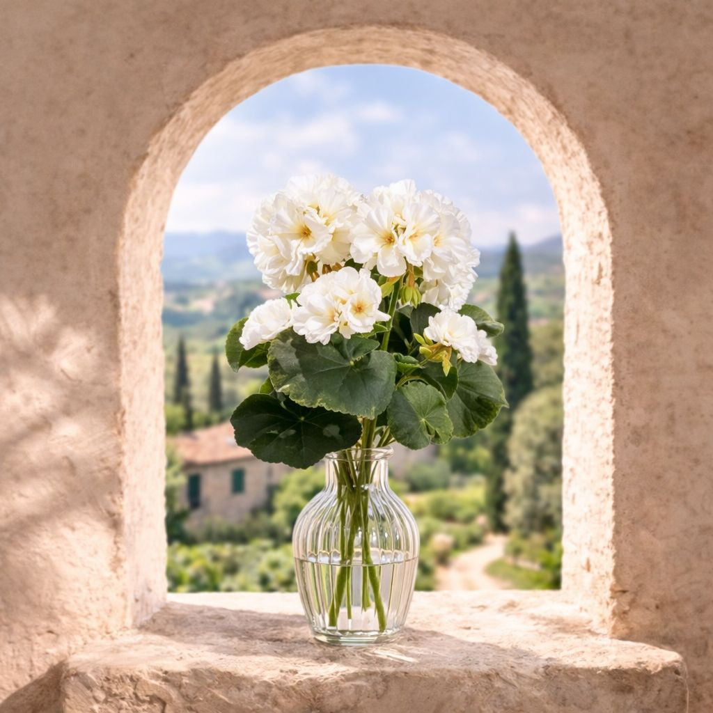 Friss, élénk fehér muskátli csokor, amely tiszta és elegáns hangulatot teremt erkélyen, ablakban vagy beltéri dekorációként, gondozás nélkül.