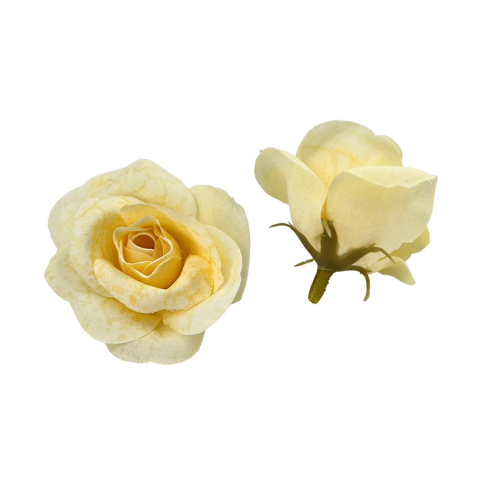 Élethű selyemvirág rózsafej 4cm halvány sárga: friss hangulatot árasztó virágdísz természetes megjelenéssel.