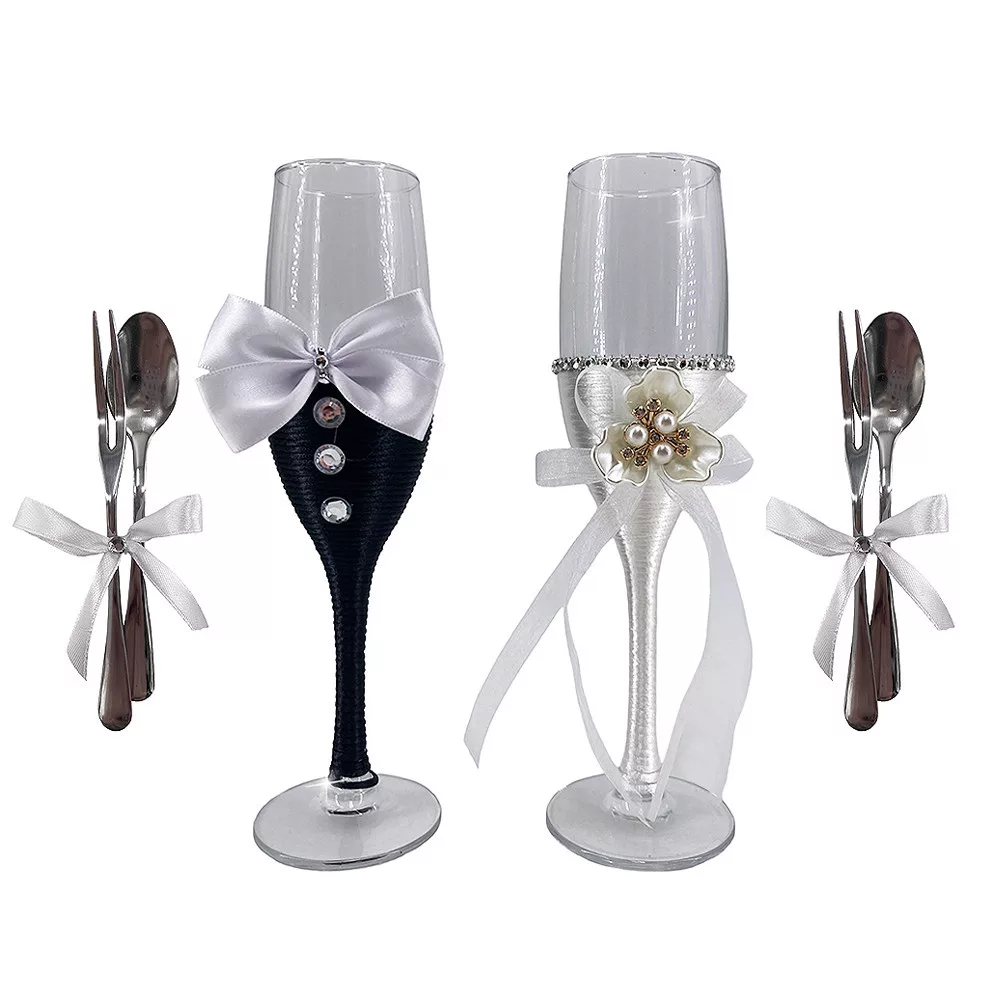 Esküvői pohár szett fekete/fehér + evőeszköz