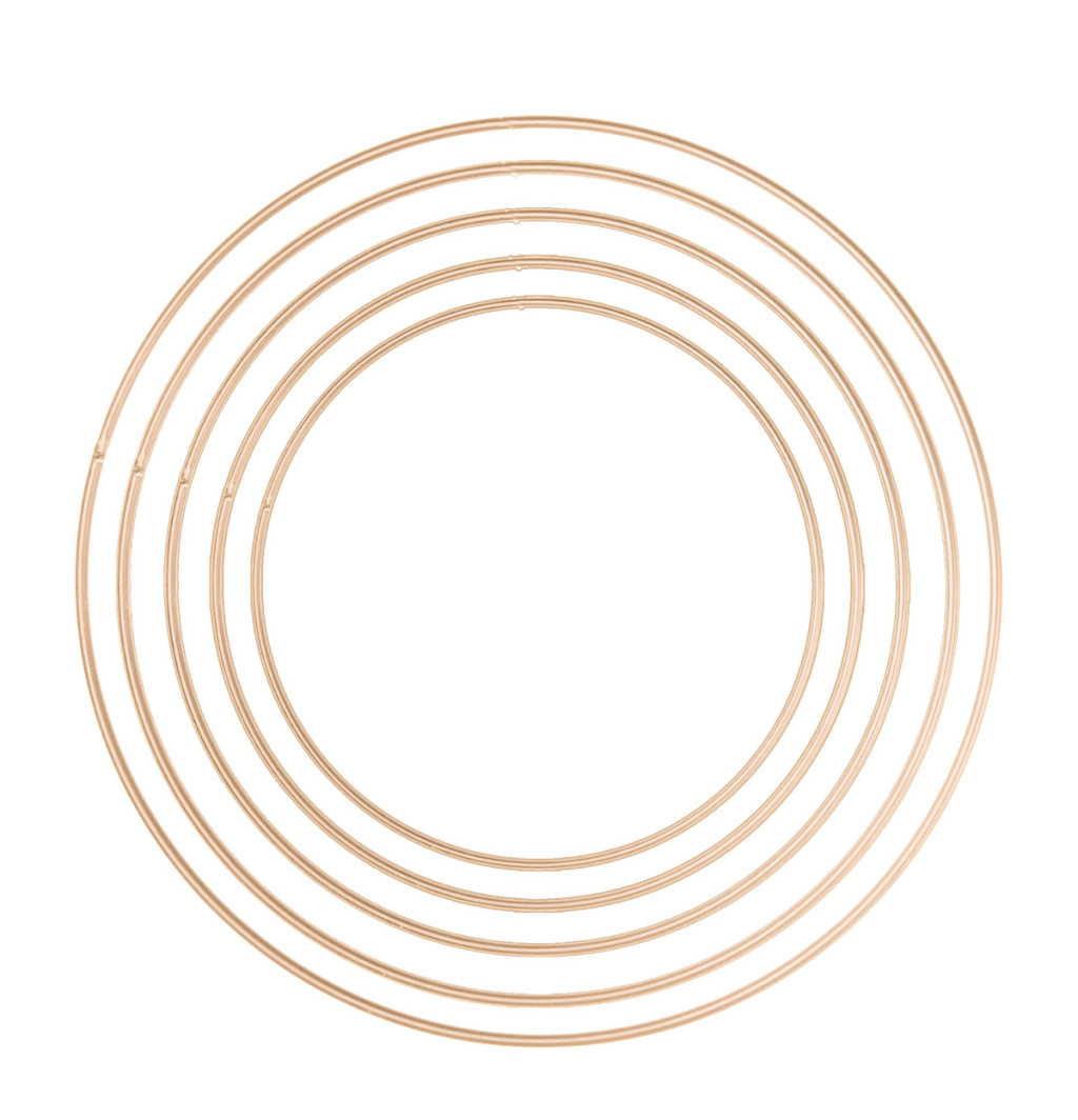 Modern, aranyszínű fém karika szett öt különböző méretben (20–40 cm). Kiválóan alkalmas koszorúk, makramé díszek, virágkompozíciók és ajtódekorációk készítéséhez. A fényes arany felület elegáns megjelenést biztosít, így minden kreatív alkotás stílusos és ünnepi hatású lesz.