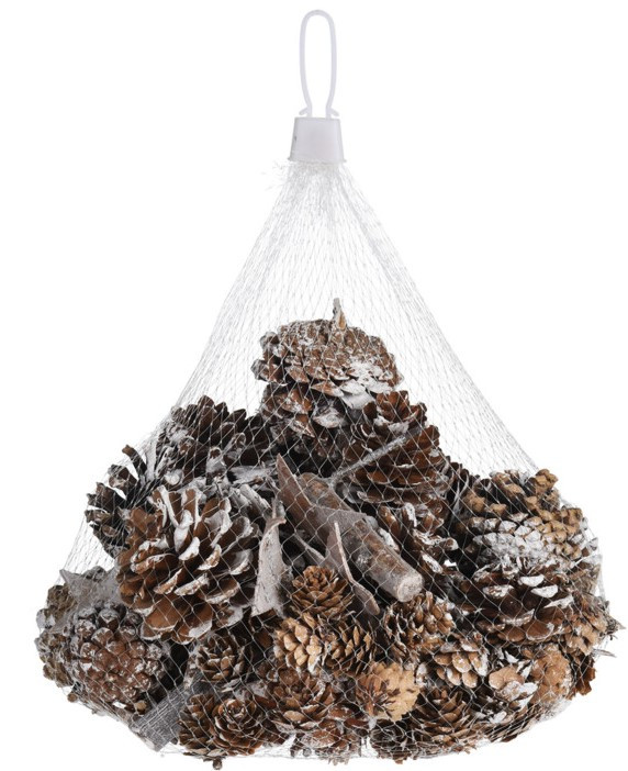 Havas hatású tobozok és fakéreg válogatás hálós zsákban, téli dekorációhoz.