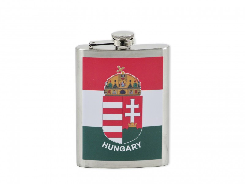 8 oz (kb. 240 ml) Hungary feliratú laposüveg magyar címerrel és zászlóval, praktikus és ajándéknak is ideális.