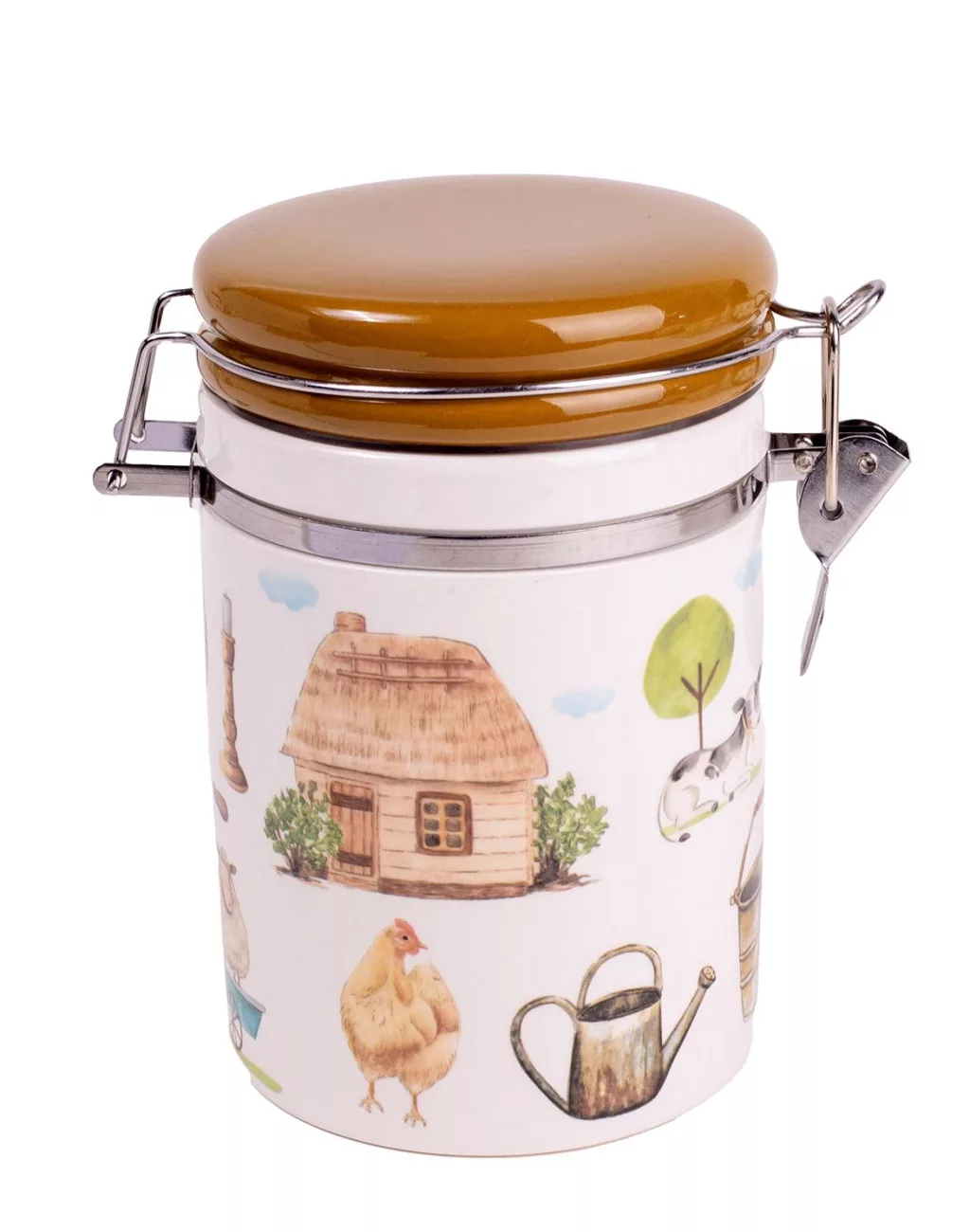 Ez a 9,5x15 cm-es kerámia csatos üveg a Happy Farm mintával nemcsak praktikus tárolóedény, hanem hangulatos konyhai kiegészítő is. A házikós, tyúkos, bárányos és kerti motívumok vidám, vidéki stílust idéznek, miközben az aranybarna fedél és a fémpántos zár elegáns megjelenést biztosít. Kiválóan alkalmas kávé, tea, cukor vagy egyéb száraz alapanyagok tárolására, és jól záródó fedele segít megőrizni a frissességet. Remek választás rusztikus hangulatú konyhákba, vagy ajándékként természetkedvelőknek.