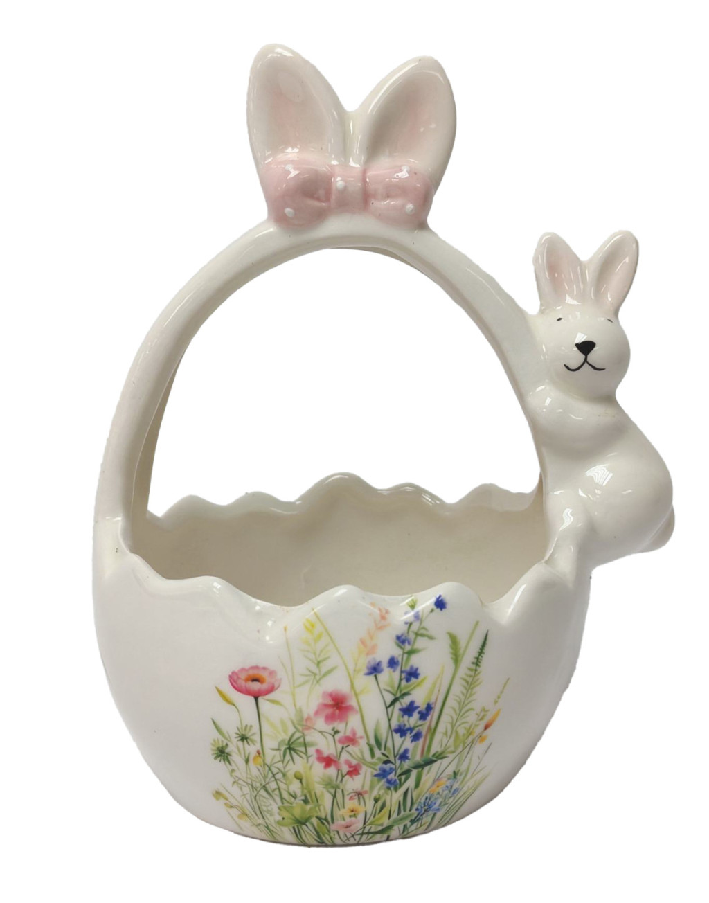 14,2 cm-es fehér kerámia kosár nyuszi figurával és színes virágmintás díszítéssel.