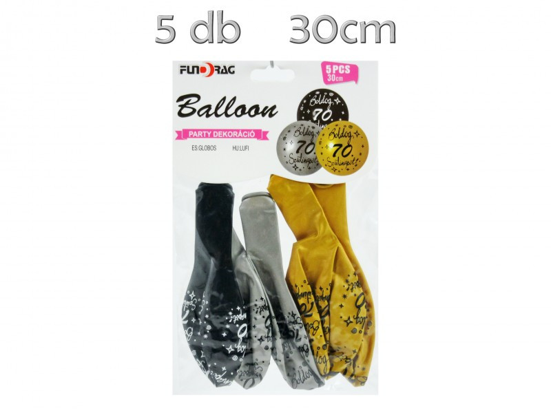 70. születésnapra készült latex lufi arany, ezüst és fekete színekben, 30 cm-es méretben, 5 darabos csomagban.