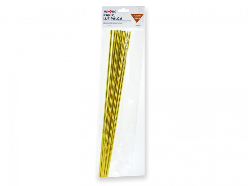 Arany színű, fényes papír lufipálca 42 cm-es hosszúságban. Praktikus és dekoratív megoldás lufik kézben tartásához vagy díszítéshez. A csomag 10 darabot tartalmaz.
