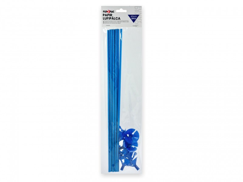 Kék színű papír lufipálca 42 cm-es hosszúságban. Mutatós és praktikus megoldás léggömbök rögzítéséhez. A csomag 10 darabot tartalmaz.