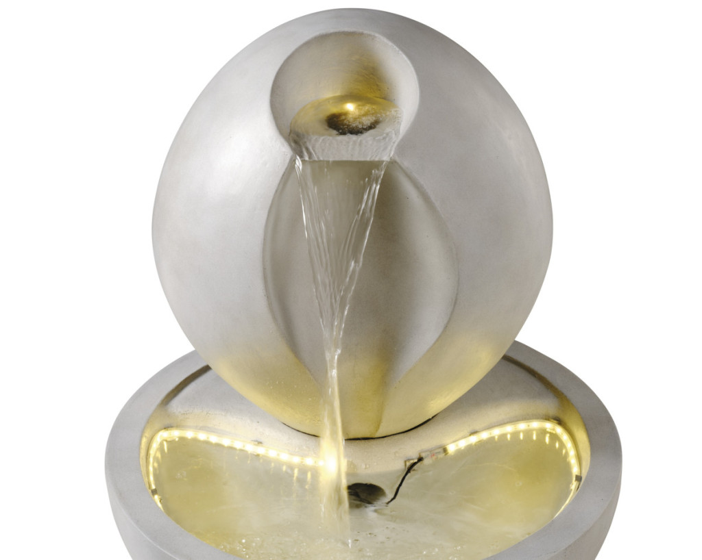 Letisztult megjelenésű, kültéri GRC szökőkút meleg fehér LED világítással, állítható vízhozammal és automatikus kikapcsolással.