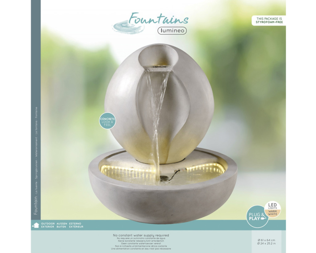 Ez a modern stílusú Lumineo kerti szökőkút nyugodt, harmonikus hangulatot teremt a kertben vagy a teraszon, miközben formavilágával elegáns kiegészítője a kültéri környezetnek. A szürke színű, lekerekített kialakítású szökőkút GRC anyagból készült, amely természetes kőhatást biztosít, ugyanakkor könnyen kezelhető és időjárásálló megoldást nyújt. A finoman csobogó víz látványát meleg fehér LED világítás emeli ki, amely kellemes fényt ad az esti órákban. A vízhozam manuálisan állítható, így a hangulat könnyedén személyre szabható, az automatikus kikapcsolás pedig kényelmes és biztonságos használatot tesz lehetővé. A beépített, 83 darab cserélhető LED hosszú távon is megbízható működést biztosít, miközben a szökőkút természetes megjelenése tökéletesen illeszkedik modern és klasszikus kertekbe egyaránt.