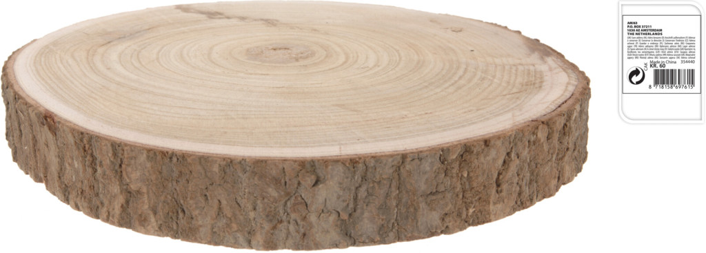 Kéreggel borított, 29-34 cm átmérőjű natúr fakorong, dekorációs és kézműves felhasználásra.