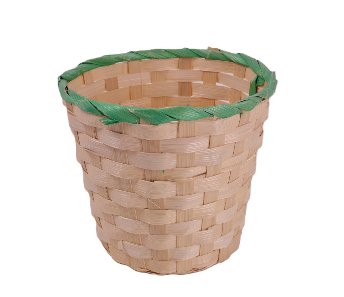 Fonott bambusz kaspó natúr testtel és zöld peremmel, 17 x 15 cm méretben dekoratív növénytartáshoz.