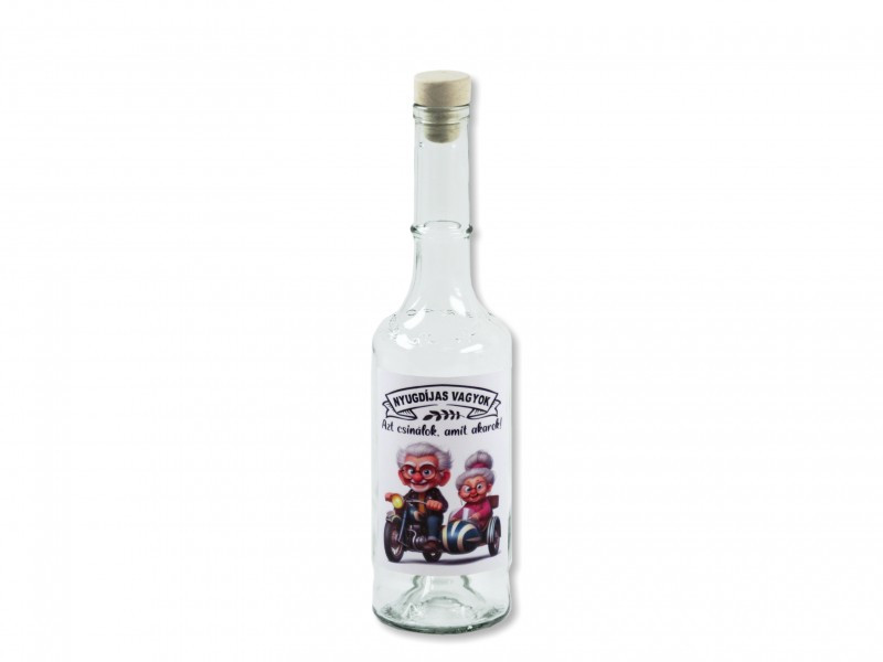 Üres, 0,5 literes pálinkás palack parafadugóval, „Nyugdíjas vagyok – Azt csinálok, amit akarok!” felirattal és motorozó idős pár vidám grafikájával. Kiváló ajándék nyugdíjba