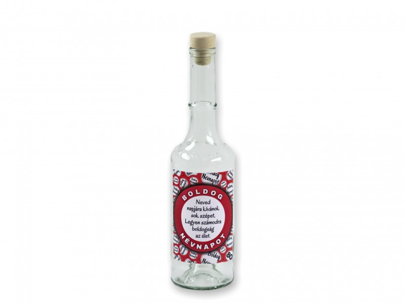 0,5 literes pálinkás üveg piros „Boldog Névnapot” felirattal és kedves idézettel. Praktikus és stílusos névnapi ajándék parafa dugóval.