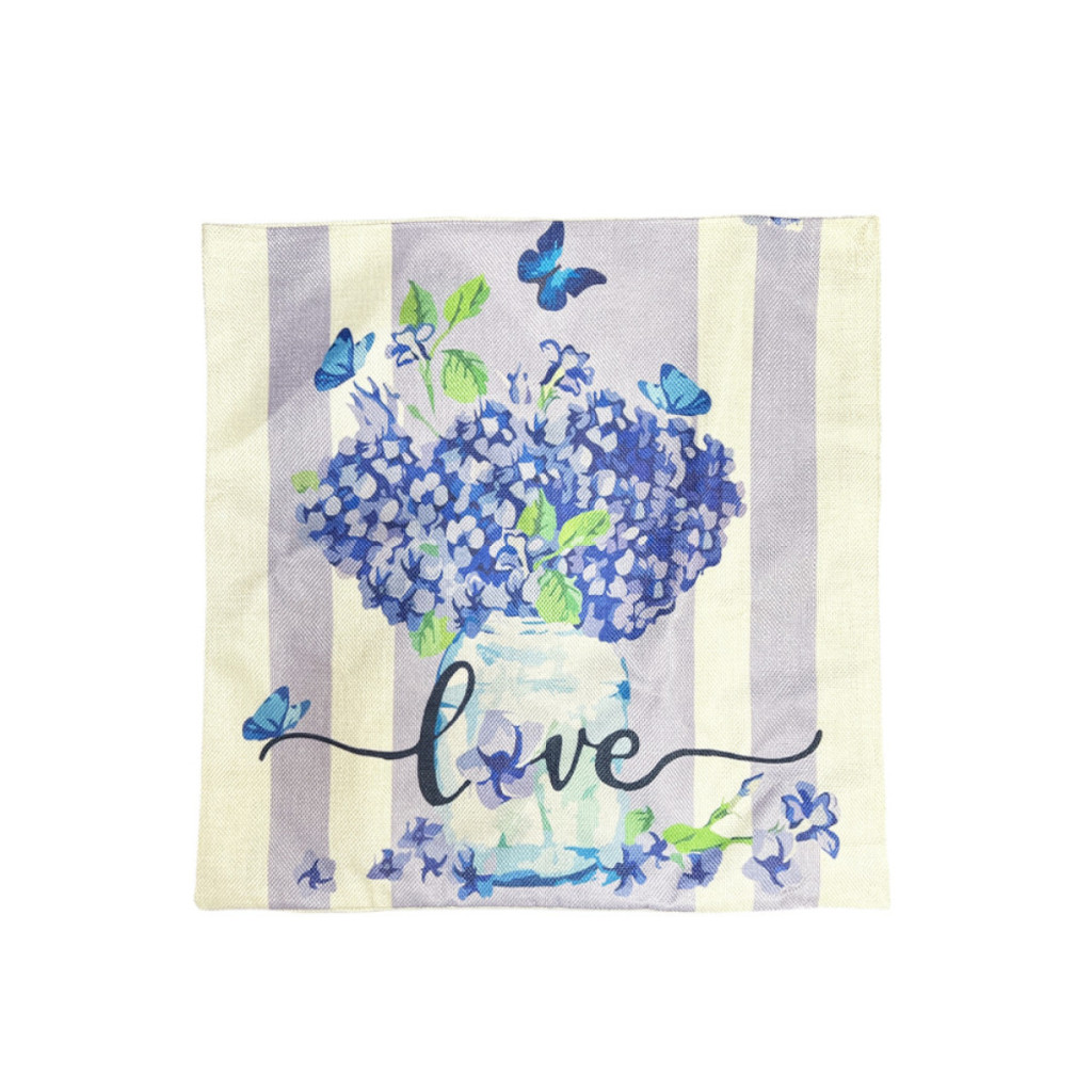 Párnahuzat tavaszi zsákvászon 43x43 cm love felirattal lila orgonás