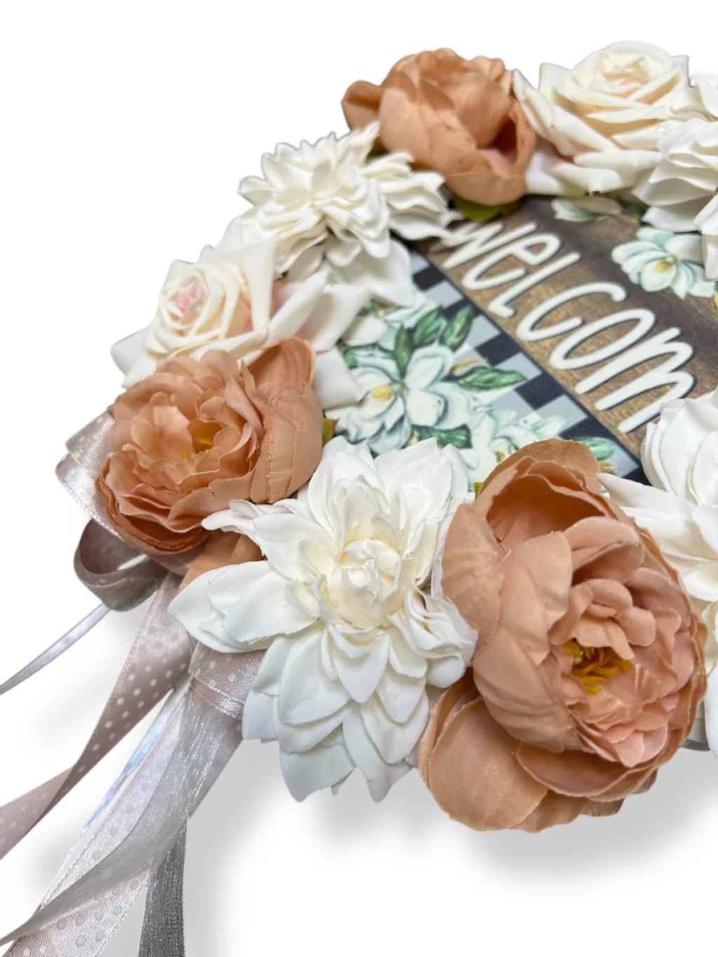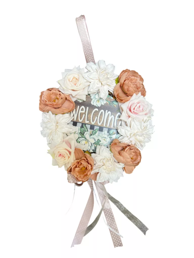 Tavaszi kopogtató élethű selyemvirággal, welcome felirattal bézs szín 20cm
