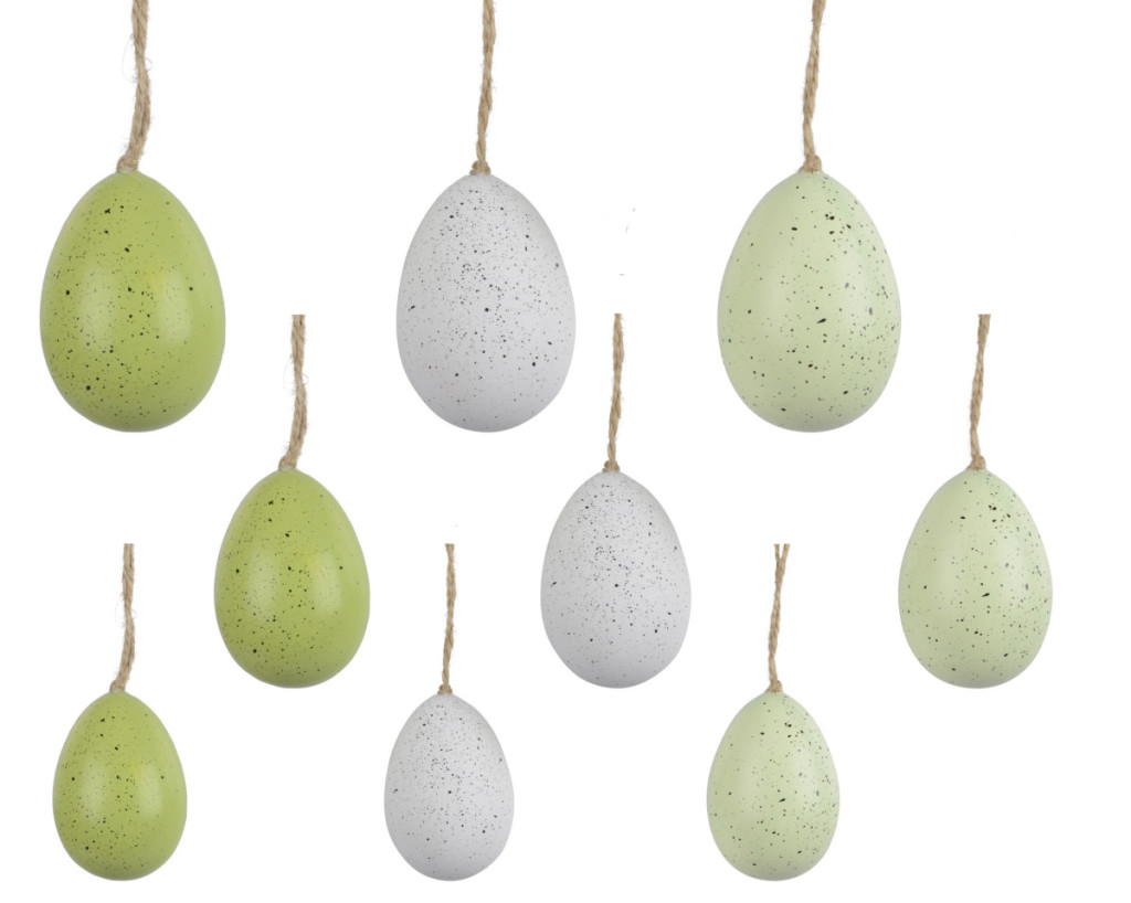 Élethű polisztirol húsvéti tojás szett 20 db-os kiszerelésben, pöttyös fehér és zöld árnyalatokkal, természetes hatású juta akasztóval, 4x6 cm.