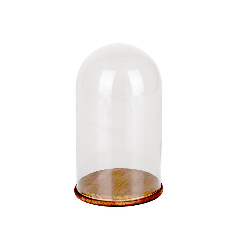 Elegáns, 12×20 cm-es üveg búra natúr fa talppal, dekorációk látványos és igényes bemutatásához.