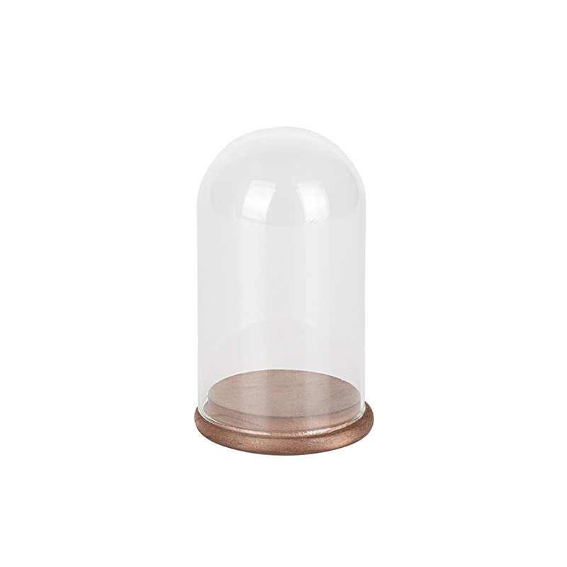 Stílusos üveg búra natúr fa talppal, 7×12 cm-es méretben dekorációk elegáns kiemeléséhez.