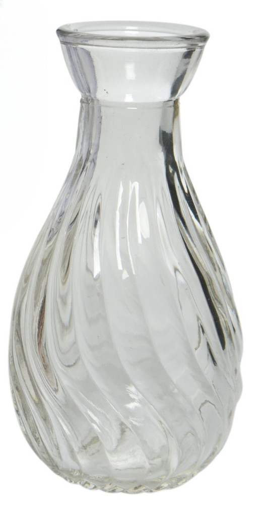 Átlátszó, csavart mintás üvegváza, 10 cm magas.