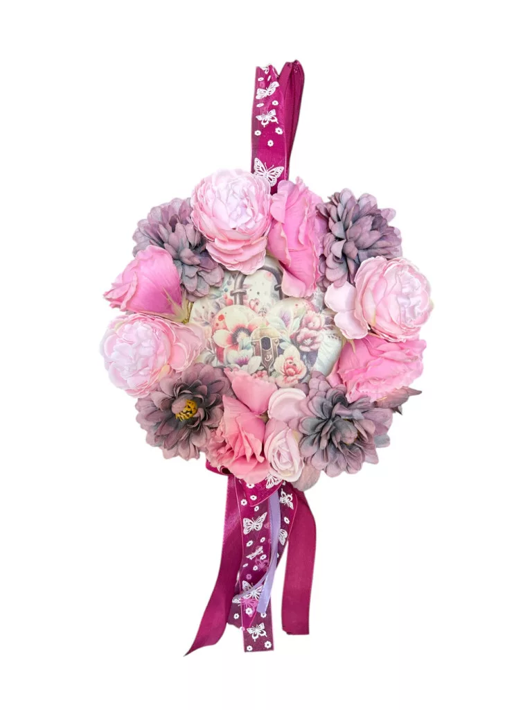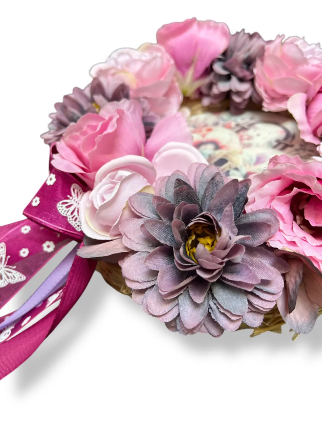Tavaszi kopogtató élethű selyemvirággal, welcome felirattal lila-rózsaszín 20cm